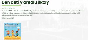 ve čtvrtek 29.5. se na školním hřišti koná akce den dětí od 14:00 do 18:00. I my tam budeme mít své sportovní místo a následně v 17:00 se normálně těšíme na společný atletický trénink. Dle možností zůstaneme buďto v areálu, nebo si půjdeme zasportovat do Prokopského údolí.